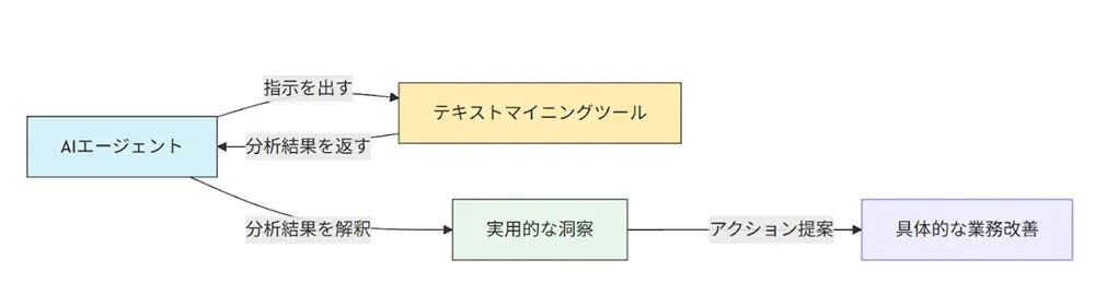 これまで、テキストマイニングツールを操作するのはあくまでも分析者(人間)でした。ツールの操作方法に習熟した上で、テキストデータを入力して分析目的に応じた操作を行っていく必要がありました。ところが、AIエージェントとテキストマイニングツールを連携すると、ツール操作の大部分はAIエージェントが行うようになります。分析目的とテキストデータをAIエージェントに入力すると、自律的にテキストマイニングツールを操作して結果を引き出し、それを更に別のエージェントへ渡して分析結果を解釈し、実用的な洞察から具体的な業務改善施策がアウトプットとして得られる、という具合です。