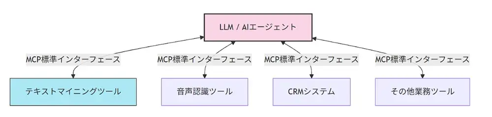 AIエージェントとテキストマイニングツールの連携を劇的に進化させたのが、MCP(Model Context Protocol)の登場です。MCPとは、大規模言語モデル(LLM)とさまざまなツールを簡単に連携させるための標準化されたインターフェースです。MCP(Model Context Protocol)の登場により、この能力は格段に強化されました。MCPは、AIエージェントが様々なツールに共通のインターフェースでアクセスするための標準プロトコルです。これにより、エージェントは「この分析にはツールAが必要だな」と判断し、そのツールの使い方を理解し、適切なパラメータで呼び出し、結果を解釈するという一連の流れをシームレスに実行できるようになりました。