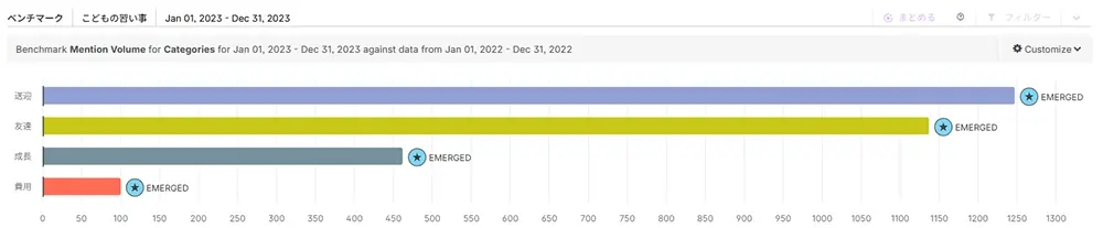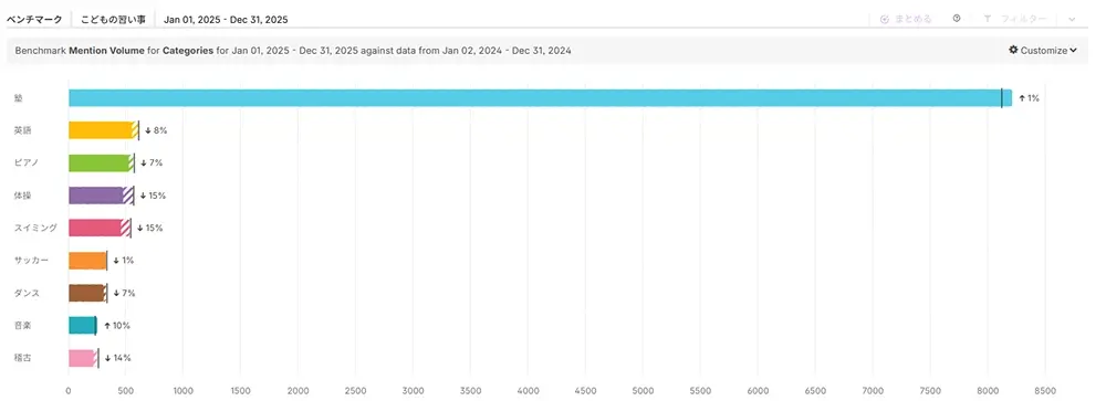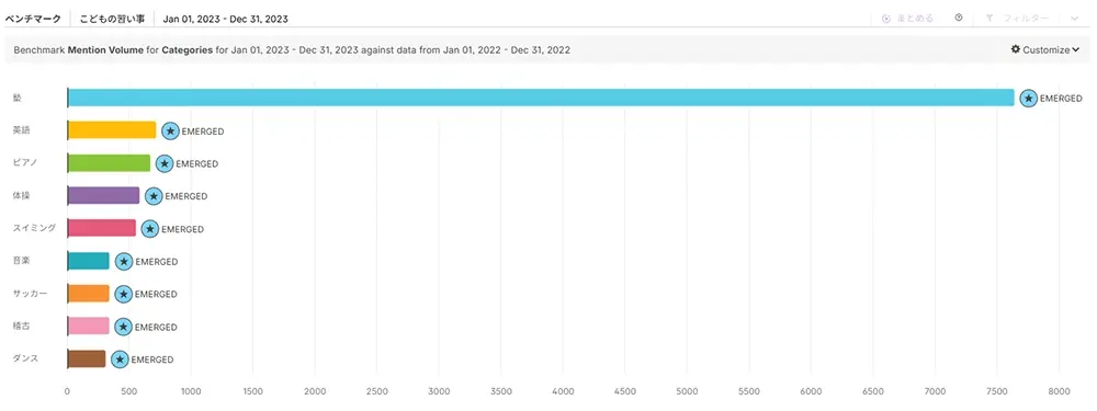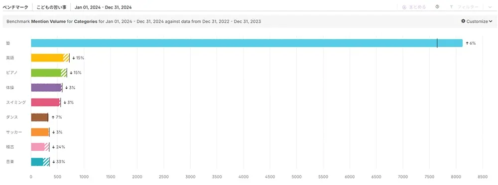 種目別(カテゴリ)ベンチマークを見ると、2023年は塾が最大で、英語・ピアノ・体操・スイミングが続く構図が確認できます。